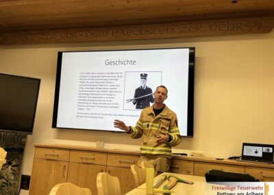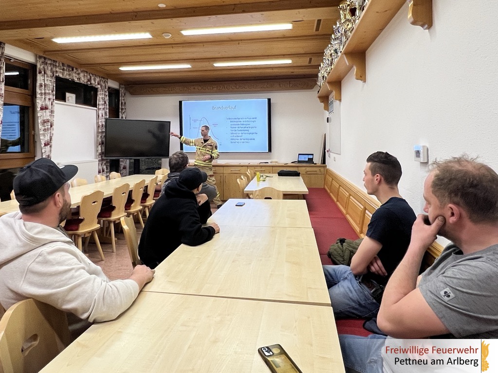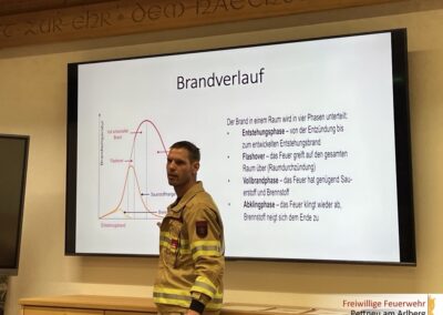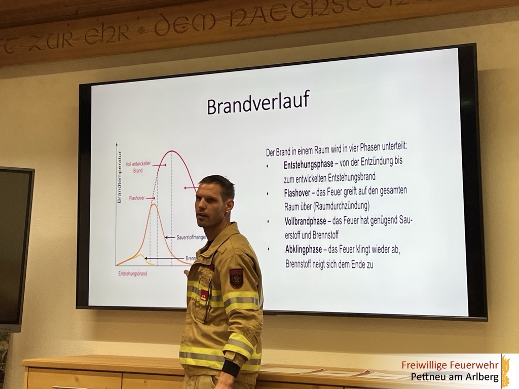 Anhand der einzelnen Brandphasen – vom Entstehungsbrand über die Wachstumsphase bis hin zum Vollbrand und der Abklingphase – wurden Gefahren und einsatztaktische Maßnahmen erklärt. Zudem wurde das richtige Vorgehen im Einsatz unter Atemschutz, insbesondere beim Innenangriff, besprochen.